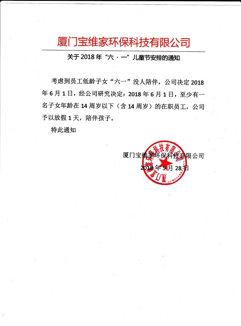 廈門寶維家環(huán)??萍加邢薰?,關(guān)于2018年‘六一’兒童節(jié)放假通知_公司新聞_新聞資訊_寶維家環(huán)??萍? /></a>