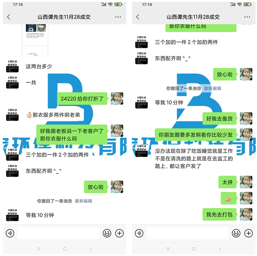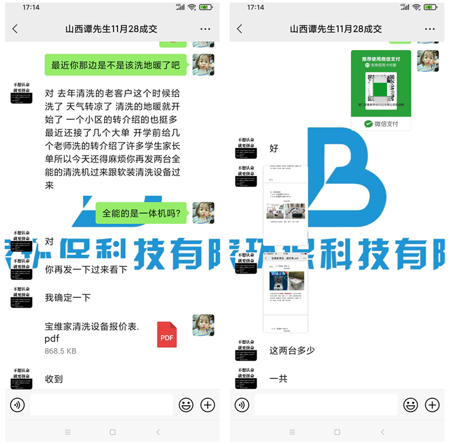 8月份譚先生反饋說(shuō)因?yàn)殚_(kāi)學(xué)前給幾個(gè)老師清洗之后,老師又轉(zhuǎn)介紹了很多學(xué)生家長(zhǎng)過(guò)來(lái)清洗,加上一個(gè)小區(qū)的轉(zhuǎn)介紹的也挺多,又接到了好幾個(gè)大單,所以想要再購(gòu)買(mǎi)一臺(tái)VJ-C2綜合清洗機(jī)和一臺(tái)軟裝清洗設(shè)備。