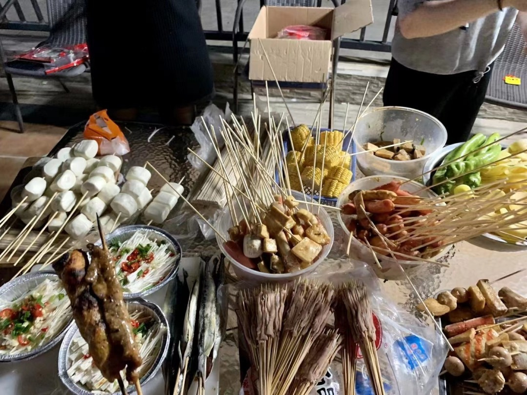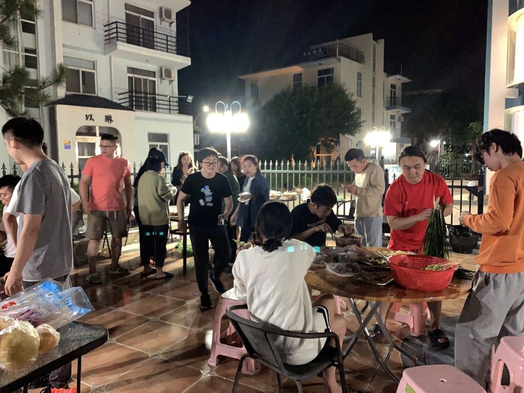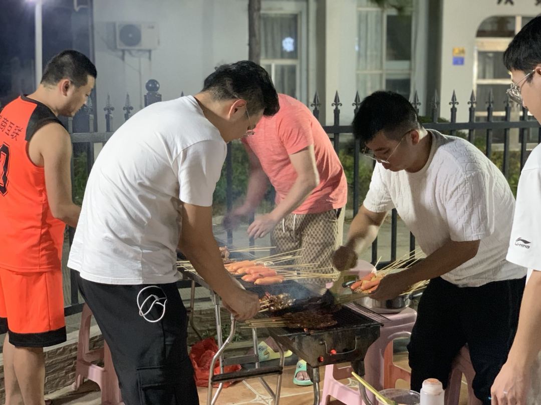 夜幕降臨進(jìn)入重頭戲,燒烤!燒烤!燒烤!無燒烤,不狂歡!你洗菜來,我穿串,我們都是小能手。大家忙得不可開交卻又有條不紊,燒烤、放煙火即將開始!