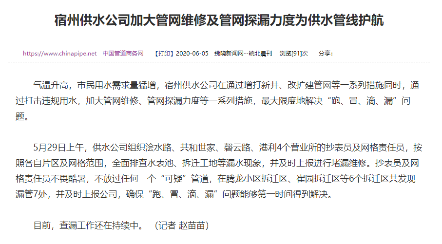 【宿州供水公司加大管網(wǎng)維修和查漏力度】