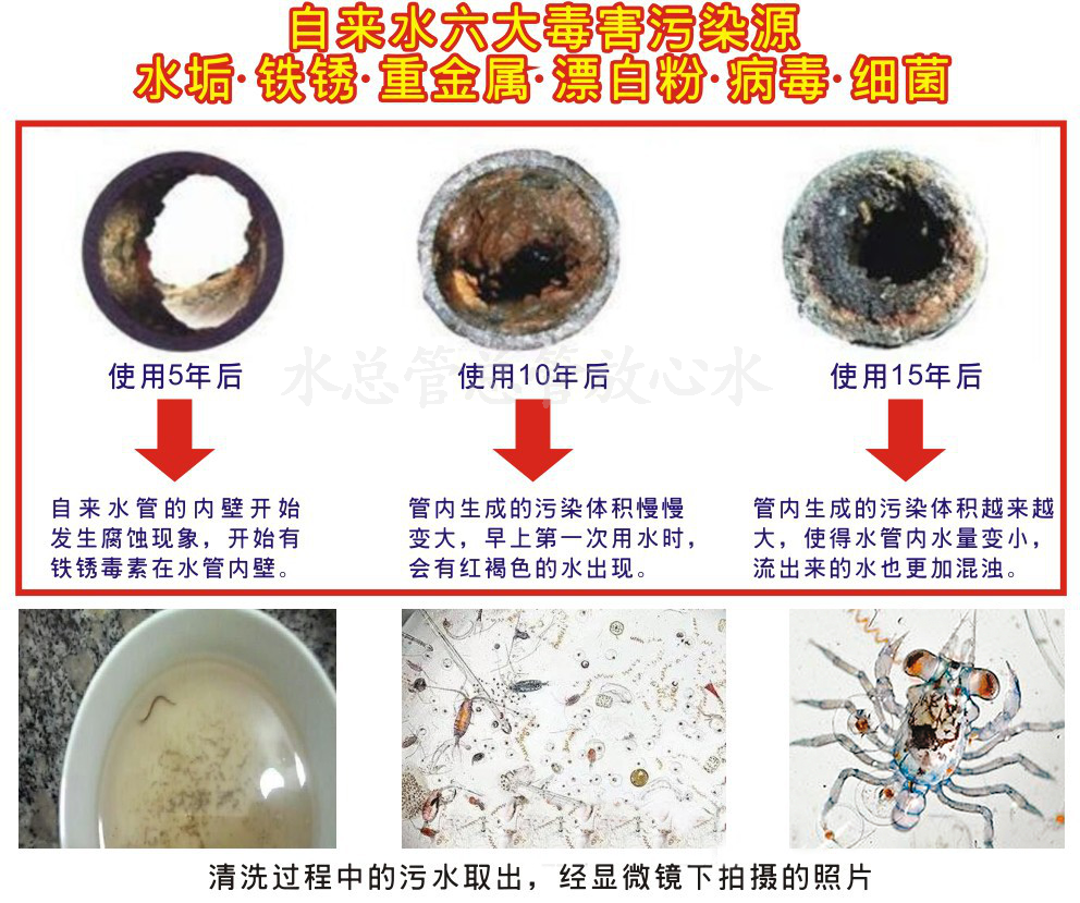 4.從抽水或供水開始,經(jīng)過老化的管道,骯臟的水塔,水中的沉淀物終全部流到家里的水管內(nèi),長時間的浸泡,沉淀物就容易積附在管內(nèi)壁.