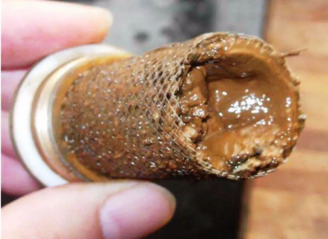 用活口扳子,可以打開這個(gè)接頭的頂端。把頂部取出來,就能看到連接著的濾網(wǎng)。用水沖洗濾網(wǎng),就完成了地暖濾網(wǎng)的基本清洗。我們可以在每年供暖前半個(gè)月到一個(gè)月的時(shí)間里清洗濾網(wǎng),觀察濾網(wǎng)的狀態(tài)。如果濾網(wǎng)上面只是有輕微泥沙,簡單清洗濾網(wǎng)后就可以了。如果濾網(wǎng)一斤被泥沙堵死了,比如下圖中這樣▼